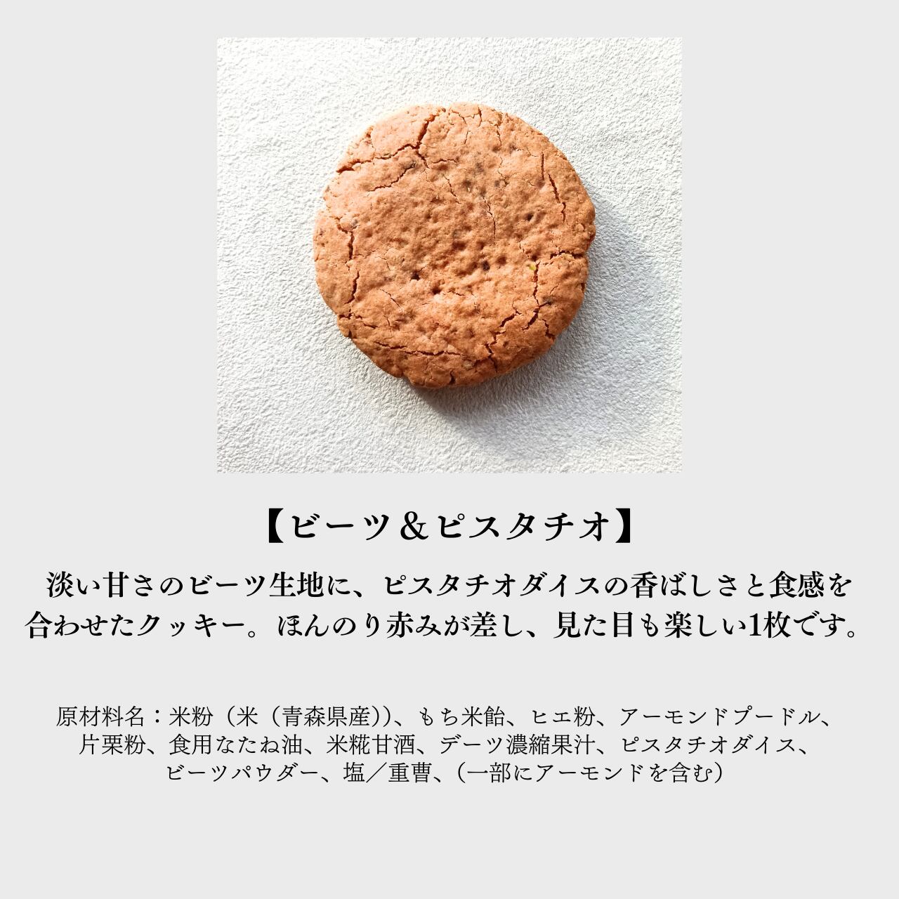 原材料名:米粉(米(青森県産))、もち米飴、ヒエ粉、アーモンドプードル、片栗粉、食用なたね油、米糀甘酒、デーツ濃縮果汁、ピスタチオダイス、ビーツパウダー、塩/重曹、(一部にアーモンドを含む)
