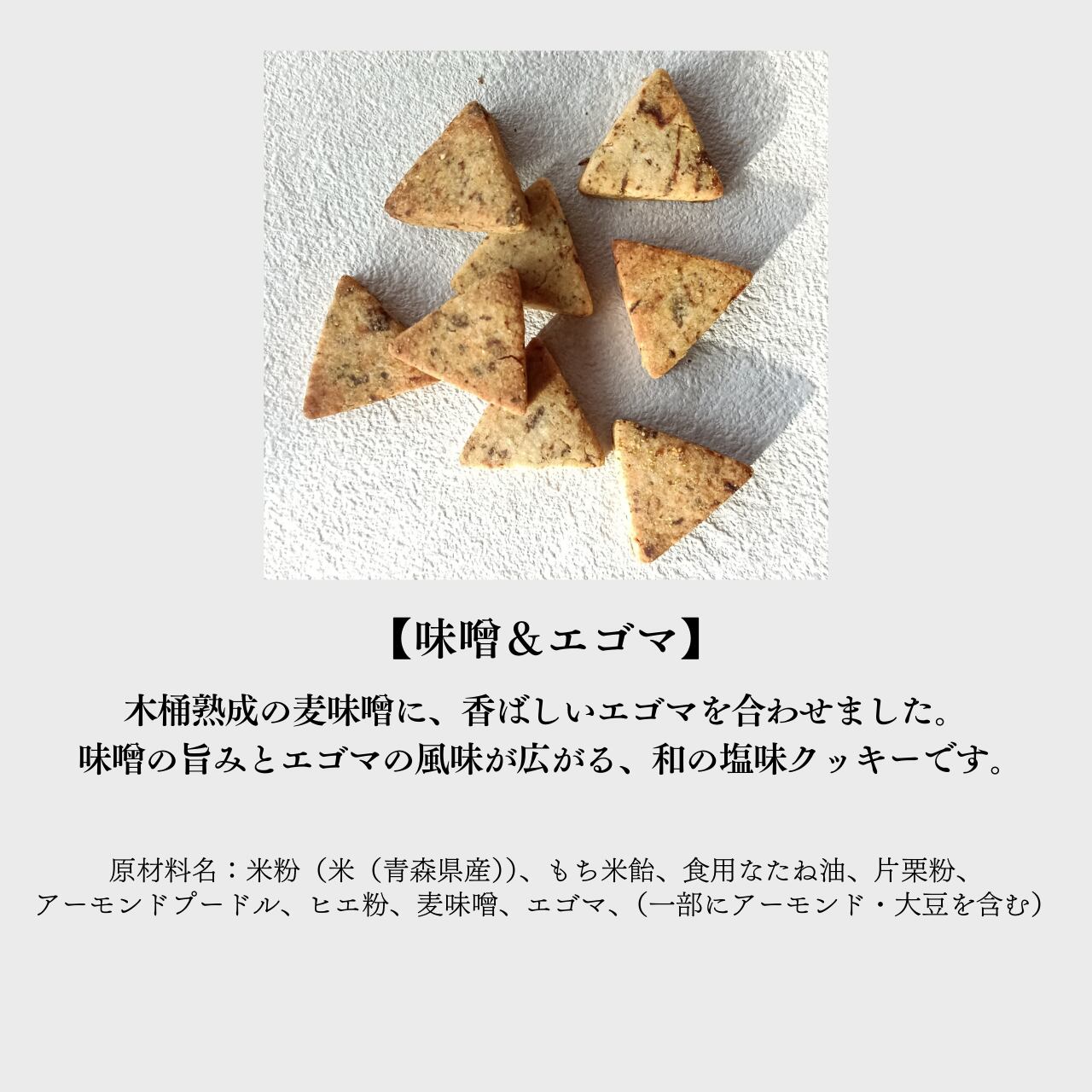 原材料名:米粉(米(青森県産))、もち米飴、食用なたね油、片栗粉、アーモンドプードル、ヒエ粉、麦味噌、エゴマ、(一部にアーモンド・大豆を含む)