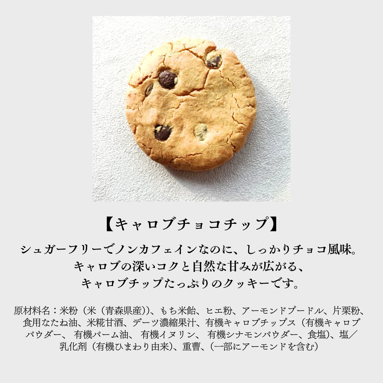 原材料名:米粉(米(青森県産))、もち米飴、ヒエ粉、アーモンドプードル、片栗粉、食用なたね油、米糀甘酒、デーツ濃縮果汁、有機キャロブチップス(有機キャロブパウダー、 有機パーム油、 有機イヌリン、 有機シナモンパウダー、食塩)、塩/乳化剤(有機ひまわり由来)、重曹、(一部にアーモンドを含む)